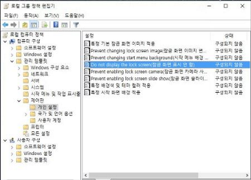 [순서 2] 그럼 아래와 같은 창이 나오는데 [컴퓨터 구성]=>[관리 템플릿]=>[제어판]=>[개인설정] 폴더를 누르면 오른쪽 설정에 "Do not display the lock screen(잠금 화면 표시 안 함)"이라고 있을 겁니다. 그걸 더블클릭합니다.