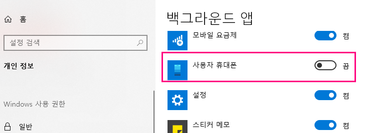 - 백그라운드에서 실행할 수 있는 앱 선택 란을 내리다보면 사용자 휴대폰이라고 있다. 끔을 누른다.