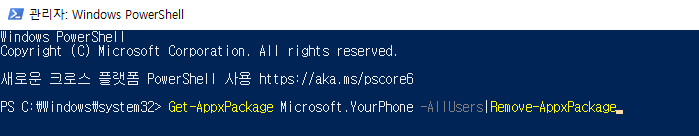 - Get-AppxPackage Microsoft.YourPhone -AllUsers | Remove-AppxPackage 를 입력한다.
