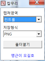 - 칼무리 오래전 캡처 프로그램이 많지 않았던 시절... 캡처 프로그램하면 떠오르는 게 칼무리라는 프로그램이었습니다. 이 프로그램은 [캡처 영역], [저장 형식], [폴더 열기]이 세 가지 분류만 한창에 나오고 나머지는 오른쪽 버튼 눌러 옵션을 조절하는 프로그램이지요. 반디카메라보다 더 가벼운 프로그램이며 사용법도 간단하게 지정되어있습니다. 기본적인 캡처 기능은 다되어 있고 특이한 기능이라면 색상 추출과 컨트롤 캡처 기능이라고 볼 수 있네요.