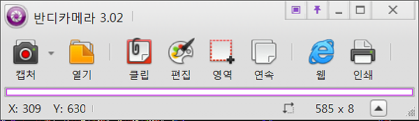 - 반디카메라는 반디캠을 만든 반디소프트에서 제작된 프로그램인데요. 기본 캡처 기능은 알 캡처와 유사하고 특이점이라면 캡처 후 바로 인쇄하는 기능이라던지 연속 캡처 기능이 있습니다. 반디카메라를 사용해보니 처리가 빨라서 그런지 가벼운 느낌이 많이 듭니다. 또한 프로그램을 실행하면 사용자 영역 지정 틀과 각종 버튼이 일체형으로 되어있어서 사용자 의도에 맞게 지정한 다음 [캡처] 버튼만 누르면 간편하게 저장됩니다. 기본적이고 직관적인 캡처 프로그램을 원하시면 반디카메라를 쓰시는 것도 나쁘진 않을 듯싶습니다.