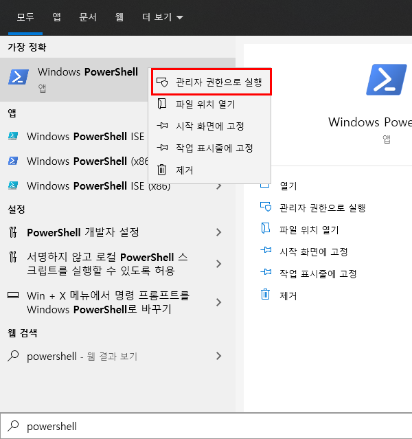 2. 위의 그림처럼 가장정확한 앱에 "Windows PowerShell"이라고 있습니다. 마우스를 가져다대고 오른쪽 버튼을 누릅니다. 그리고 "관리자 권한으로 실행"을 누릅니다.